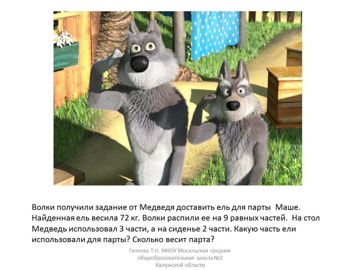 Волки получили задание от Медведя доставить ель для парты Маше. Найденная ель весила 72 кг. Волки распили ее на 9 равных частей. На стол Медведь использовал 3 части, а на сиденье 2 части. Какую часть ели использовали для парты? Сколько весит парта?