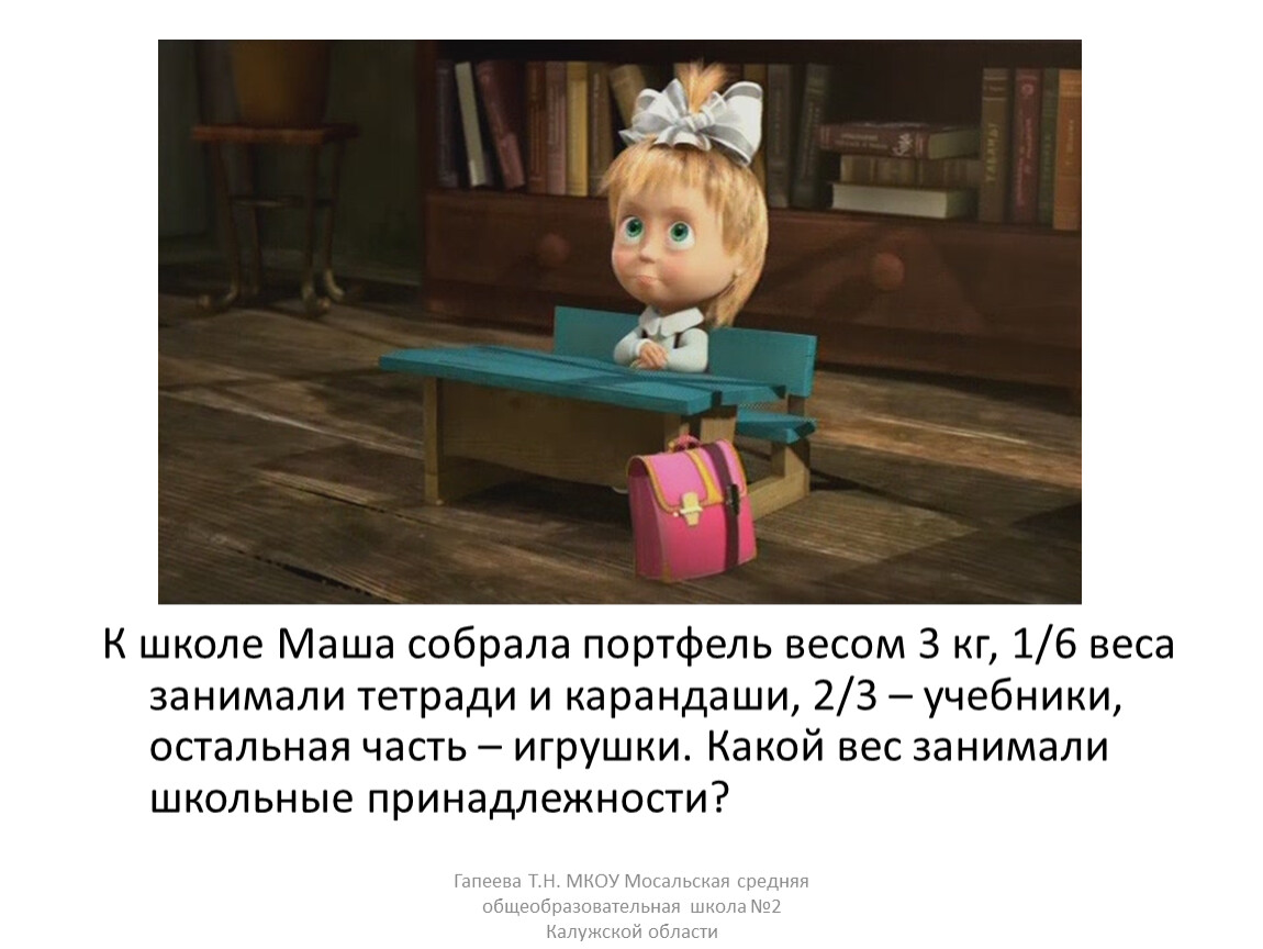 К школе Маша собрала портфель весом 3 кг, 1/6 веса занимали тетради и карандаши, 2/3 – учебники, остальная часть – игрушки. Какой вес занимали школьные принадлежности?