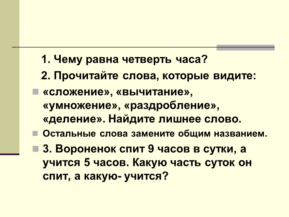3. Вороненок спит 9 часов в сутки, а учится 5 часов. Какую часть суток он спит, а какую- учится?