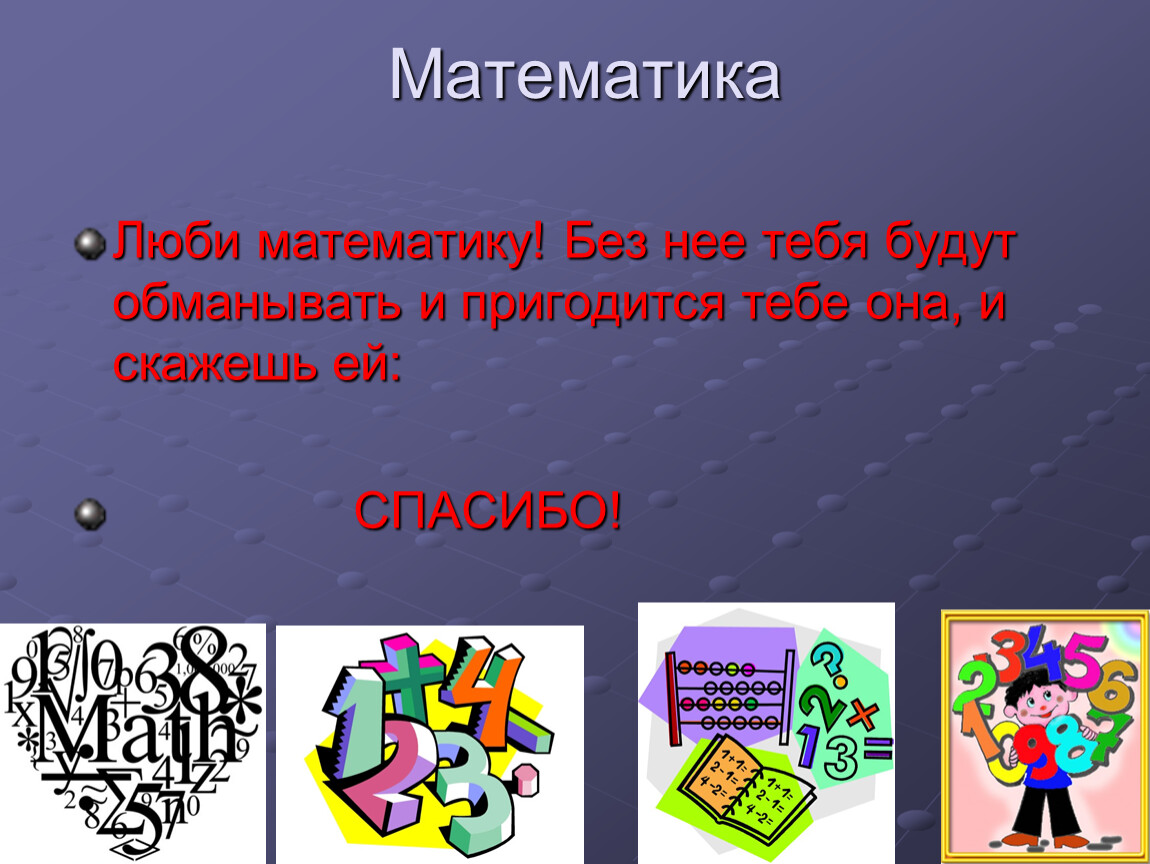 Люби математику! Без нее тебя будут обманывать и пригодится тебе она, и скажешь ей:
