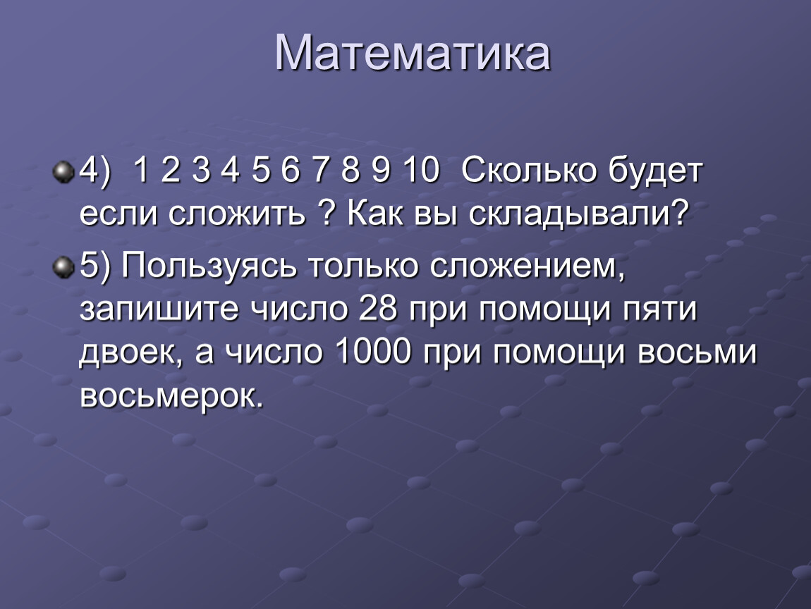 4) 1 2 3 4 5 6 7 8 9 10 Сколько будет если сложить ? Как вы складывали?