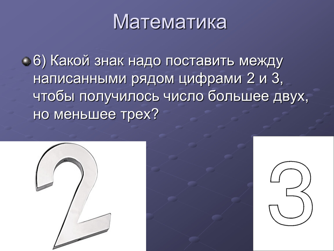 6) Какой знак надо поставить между написанными рядом цифрами 2 и 3, чтобы получилось число большее двух, но меньшее трех?