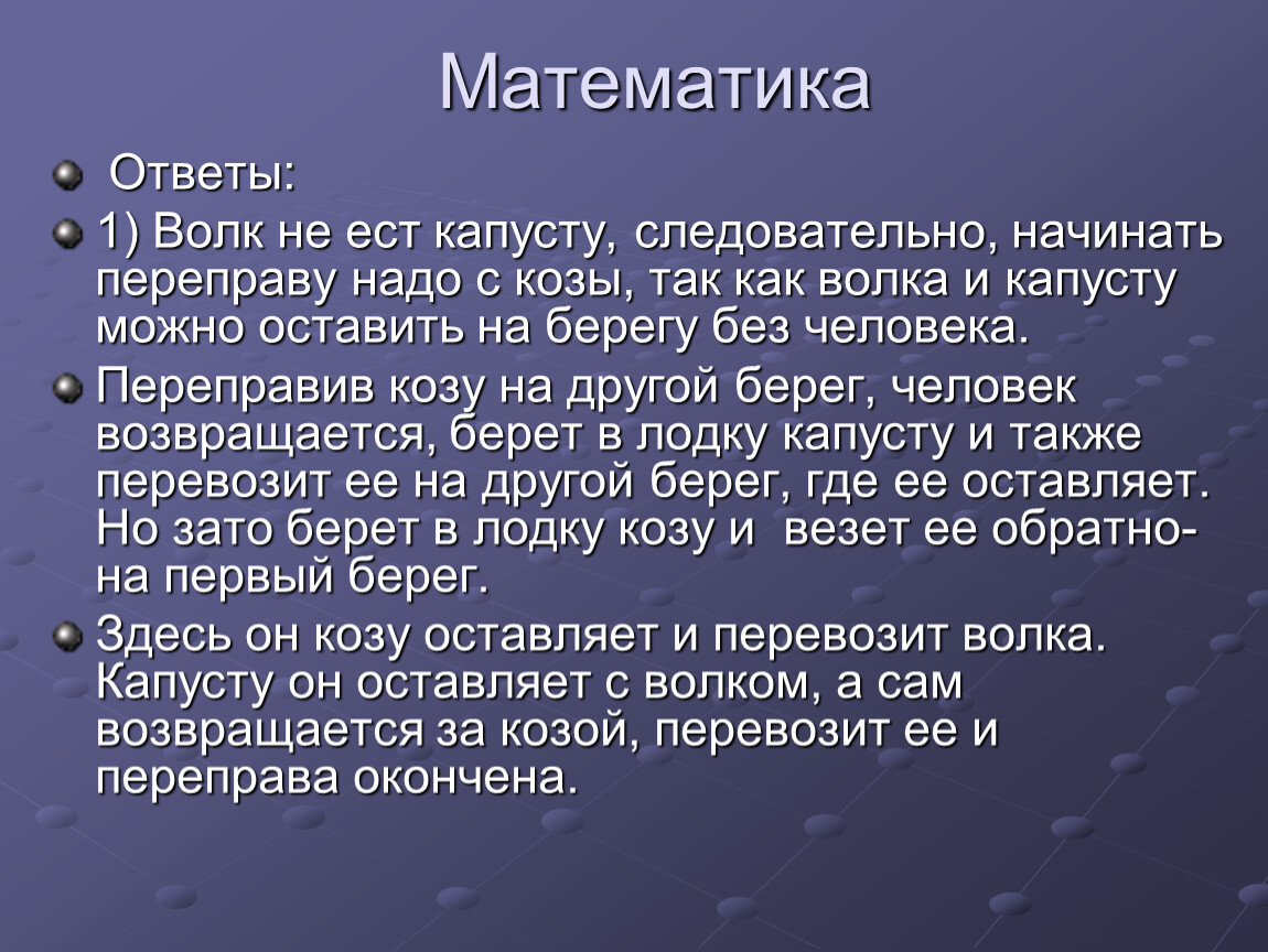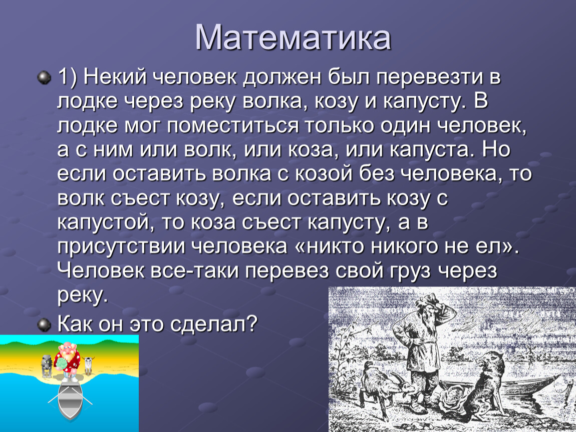 1) Некий человек должен был перевезти в лодке через реку волка, козу и капусту. В лодке мог поместиться только один человек, а с ним или волк, или коза, или капуста. Но если оставить волка с козой без человека, то волк съест козу, если оставить козу с капустой, то коза съест капусту, а в присутствии человека «никто никого не ел». Человек все-таки перевез свой груз через реку.