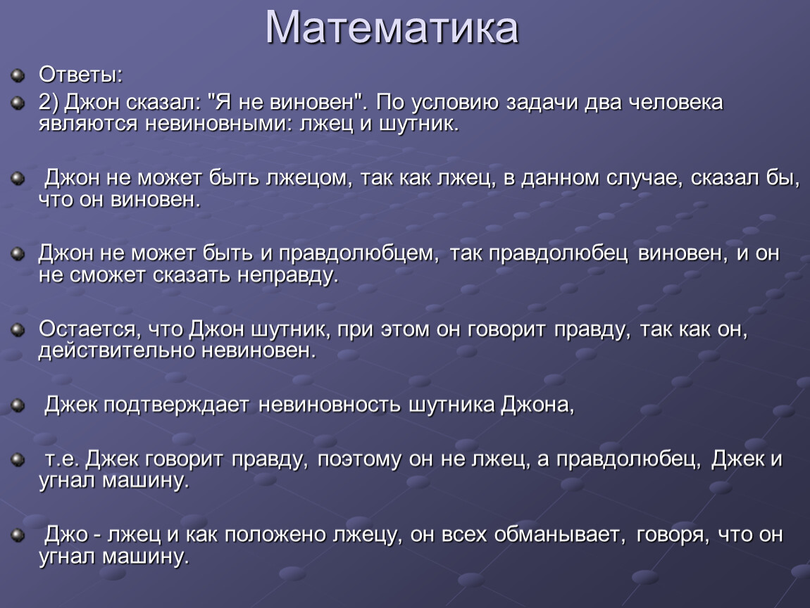 2) Джон сказал: "Я не виновен". По условию задачи два человека являются невиновными: лжец и шутник.