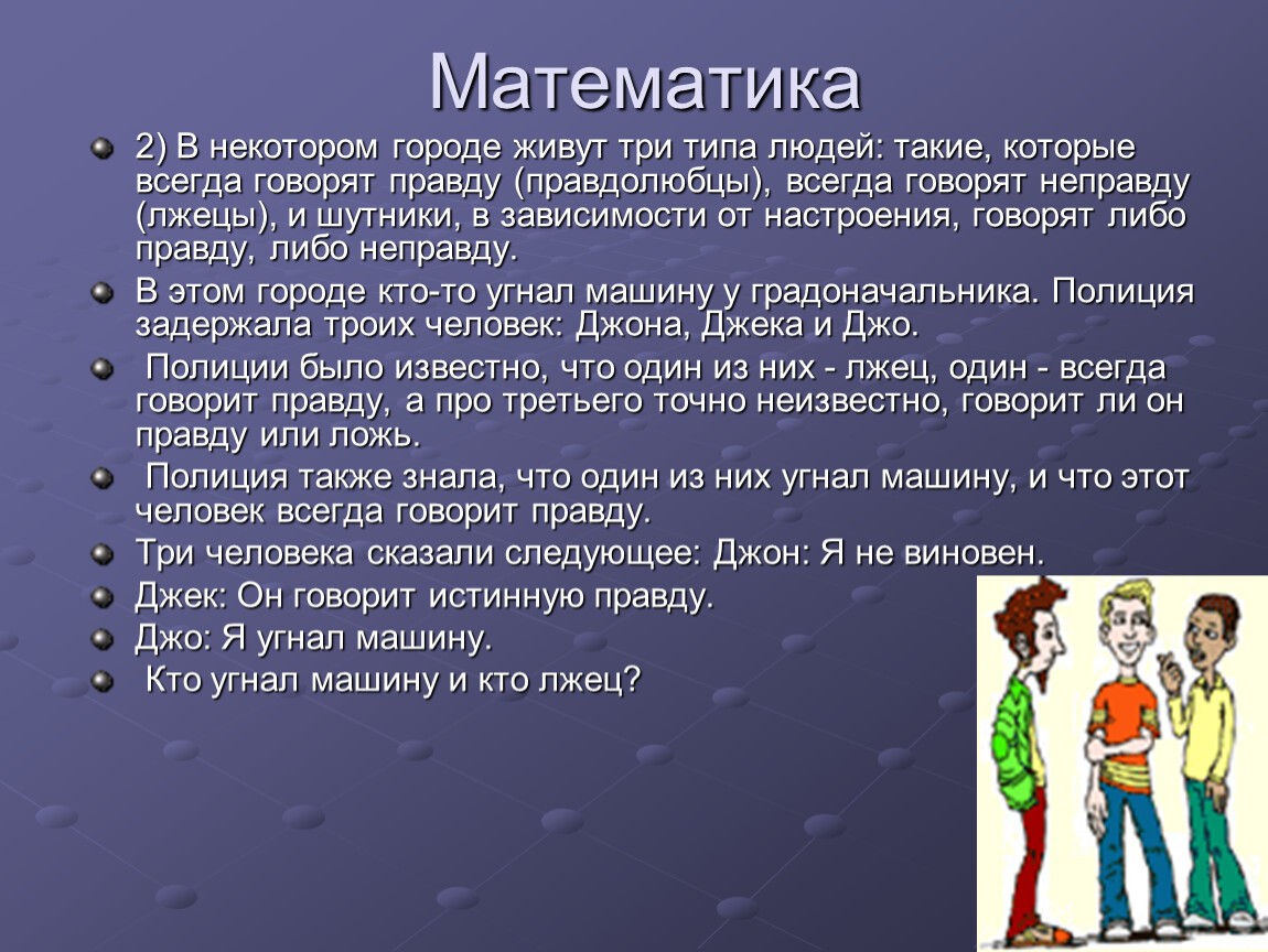 2) В некотором городе живут три типа людей: такие, которые всегда говорят правду (правдолюбцы), всегда говорят неправду (лжецы), и шутники, в зависимости от настроения, говорят либо правду, либо неправду.