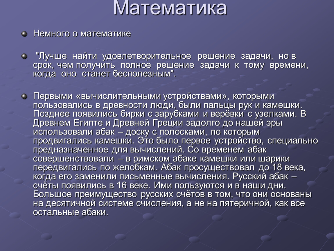 Первыми «вычислительными устройствами», которыми пользовались в древности люди, были пальцы рук и камешки. Позднее появились бирки с зарубками и верёвки с узелками. В Древнем Египте и Древней Греции задолго до нашей эры использовали абак – доску с полосками, по которым продвигались камешки. Это было первое устройство, специально предназначенное для вычислений. Со временем абак совершенствовали – в римском абаке камешки или шарики передвигались по желобкам. Абак просуществовал до 18 века, когда его заменили письменные вычисления. Русский абак – счёты появились в 16 веке. Ими пользуются и в наши дни. Большое преимущество русских счётов в том, что они основаны на десятичной системе счисления, а не на пятеричной, как все остальные абаки.