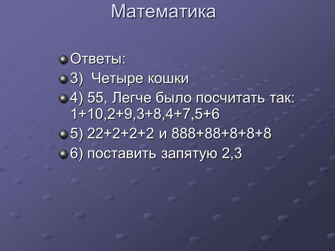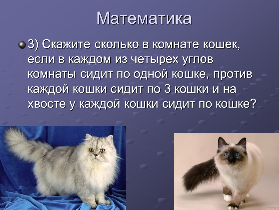 3) Скажите сколько в комнате кошек, если в каждом из четырех углов комнаты сидит по одной кошке, против каждой кошки сидит по 3 кошки и на хвосте у каждой кошки сидит по кошке?