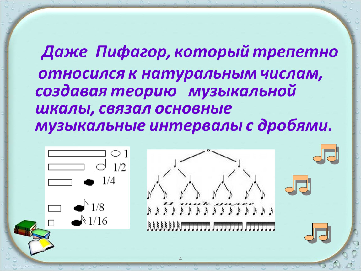 относился к натуральным числам, создавая теорию музыкальной шкалы, связал основные музыкальные интервалы с дробями.