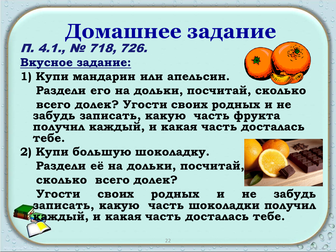 всего долек? Угости своих родных и не забудь записать, какую часть фрукта получил каждый, и какая часть досталась тебе.