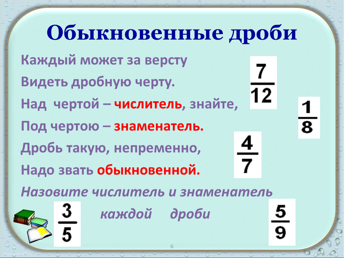 Прочитайте дроби. Что показывает числитель и знаменатель каждой дроби?