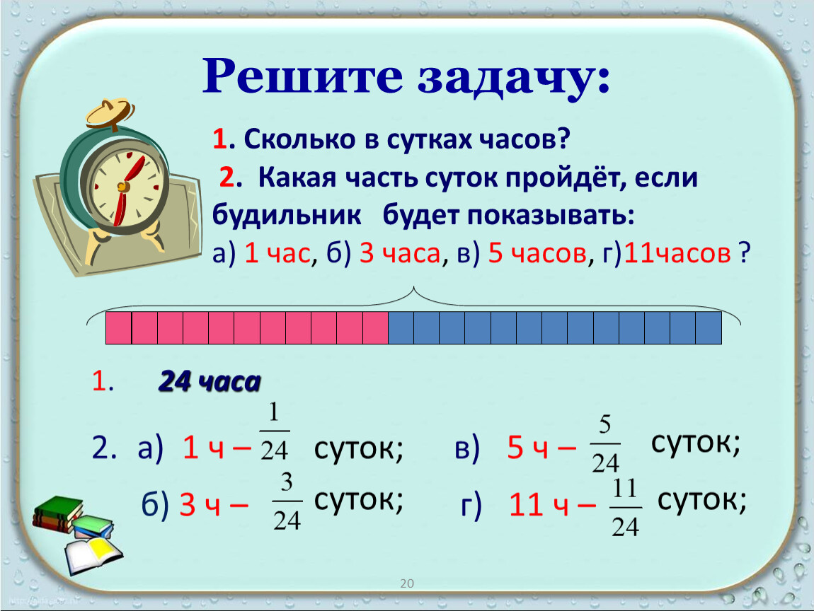 2. Какая часть суток пройдёт, если будильник будет показывать: