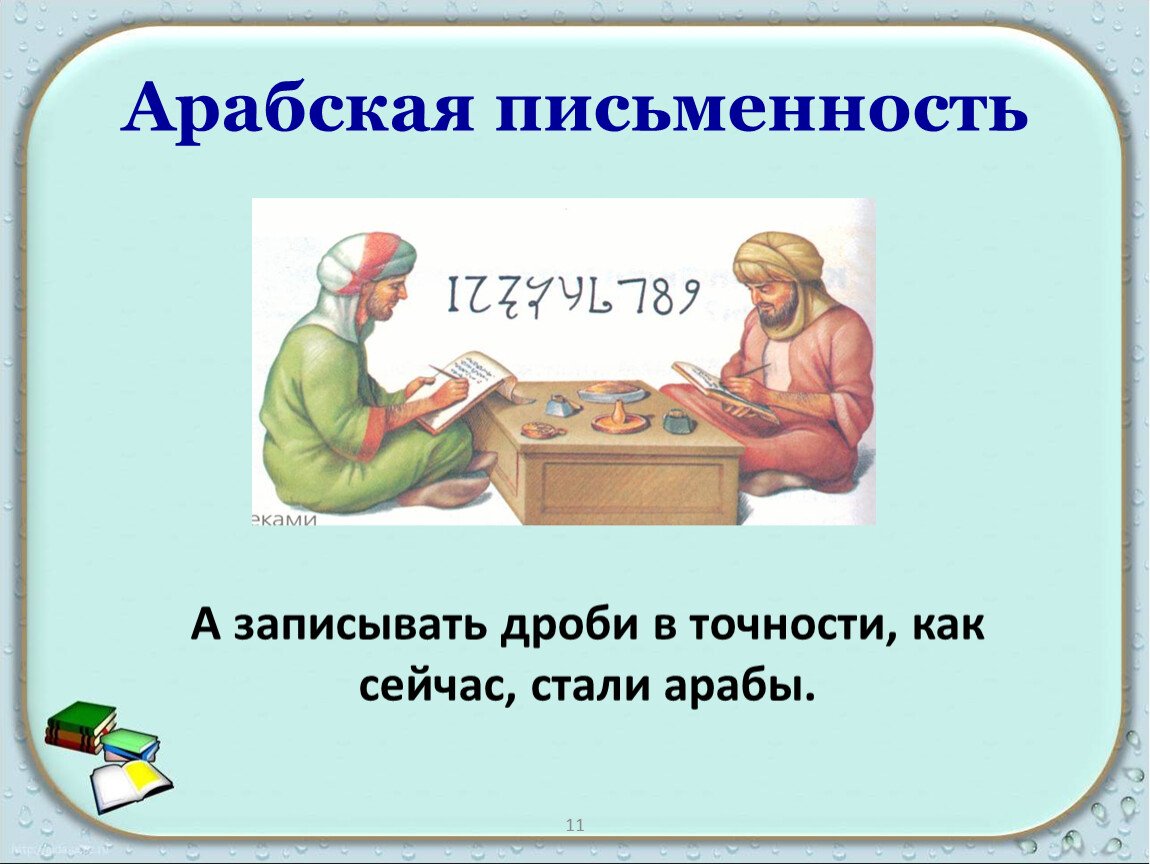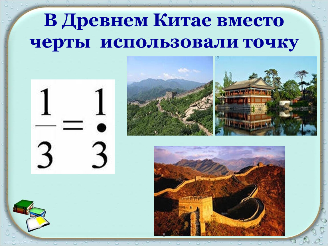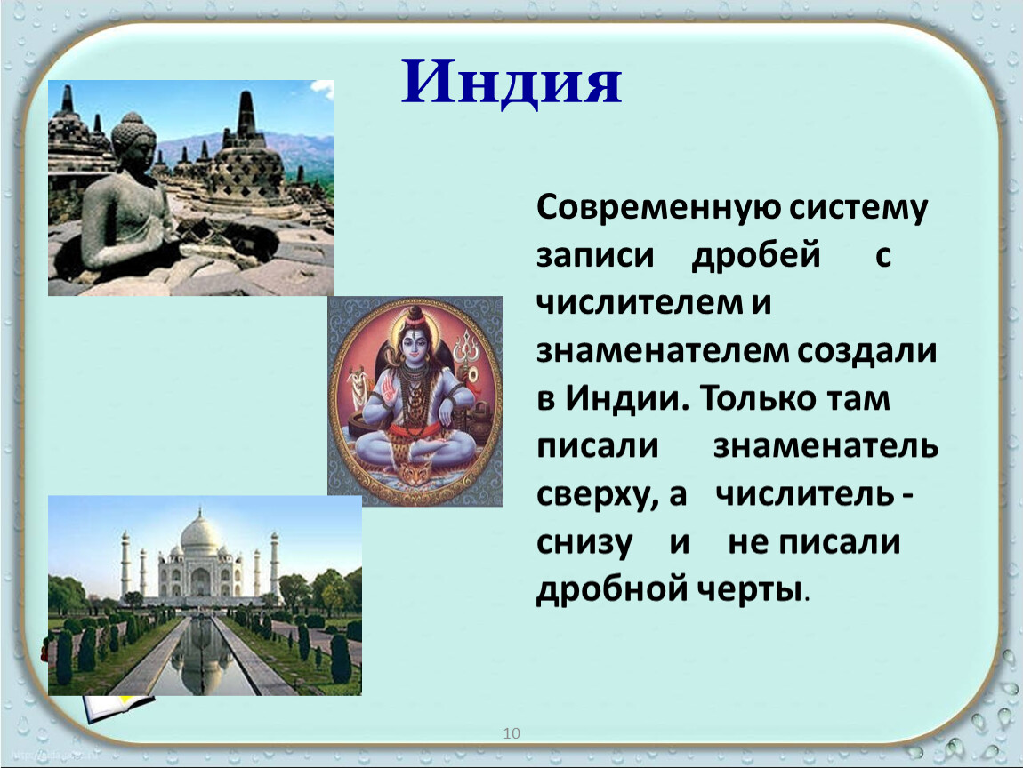 Современную систему записи дробей с числителем и знаменателем создали в Индии. Только там писали знаменатель сверху, а числитель - снизу и не писали дробной черты.