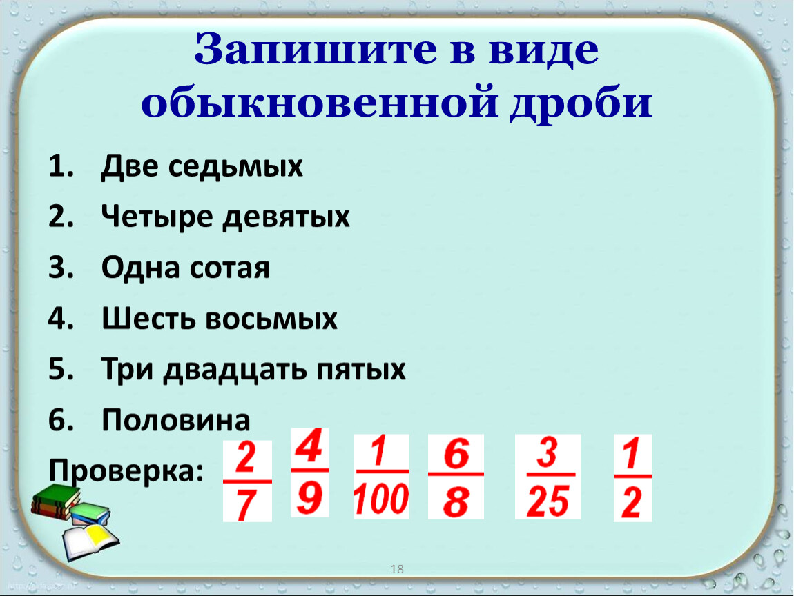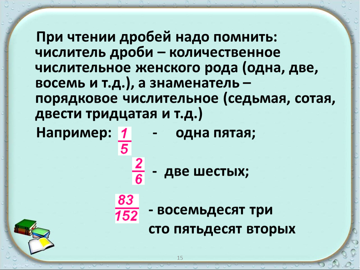 При чтении дробей надо помнить: числитель дроби – количественное числительное женского рода (одна, две, восемь и т.д.), а знаменатель – порядковое числительное (седьмая, сотая, двести тридцатая и т.д.)