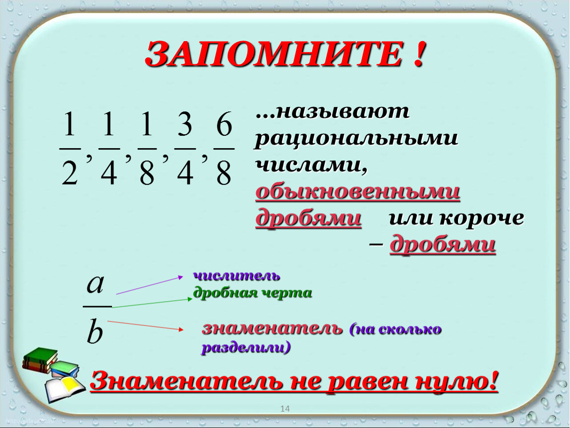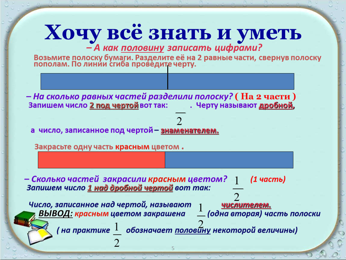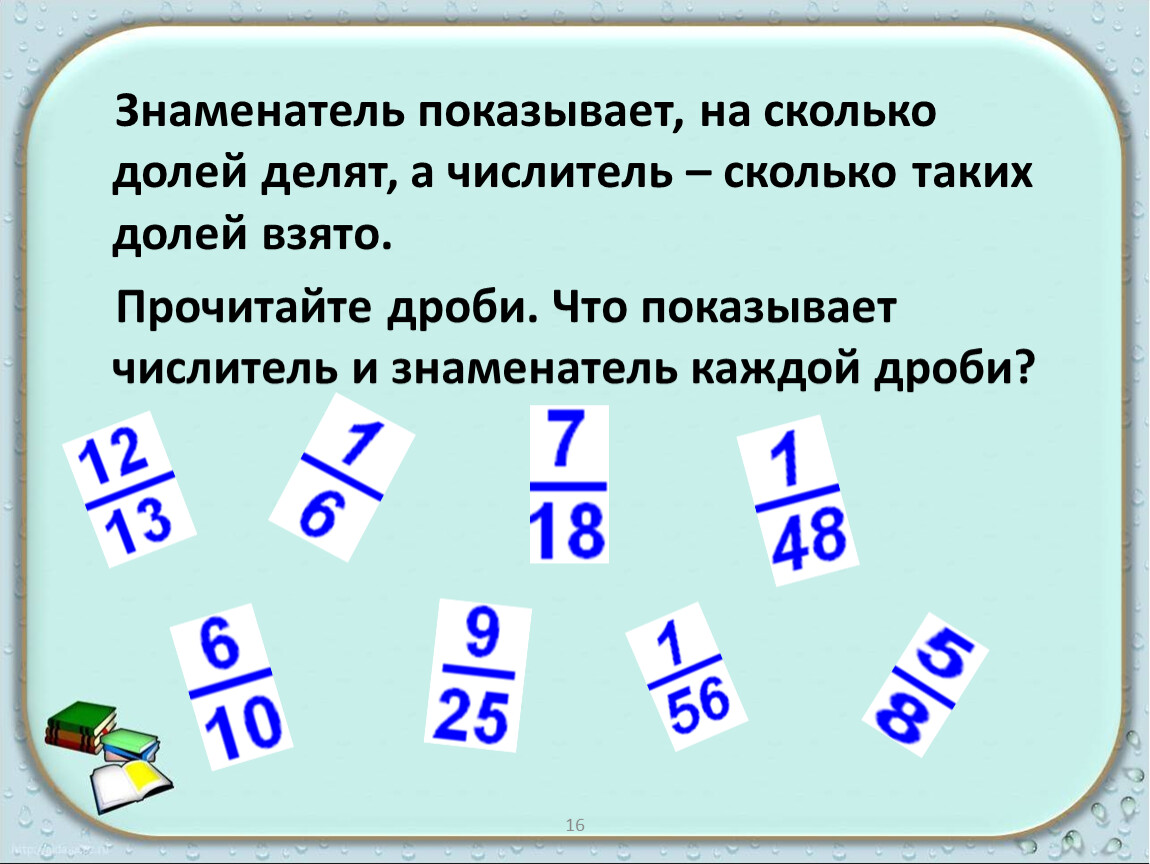 Знаменатель показывает, на сколько долей делят, а числитель – сколько таких долей взято.