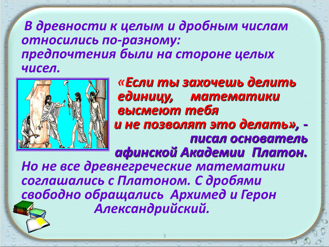 Но не все древнегреческие математики соглашались с Платоном. С дробями свободно обращались Архимед и Герон