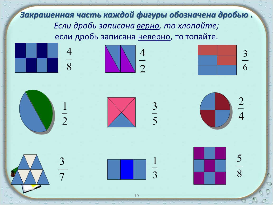 Закрашенная часть каждой фигуры обозначена дробью . Если дробь записана верно, то хлопайте; если дробь записана неверно, то топайте.