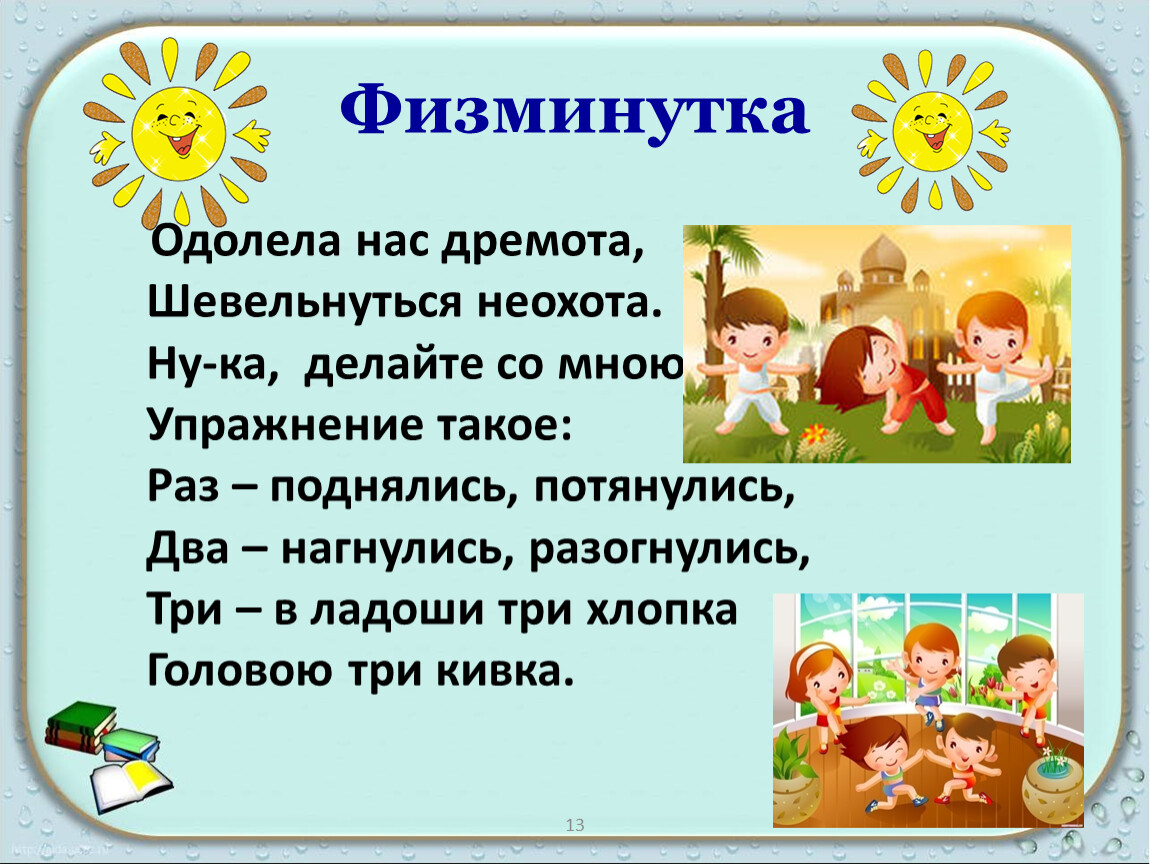 Одолела нас дремота, Шевельнуться неохота.Ну-ка, делайте со мною Упражнение такое:Раз – поднялись, потянулись,Два – нагнулись, разогнулись,Три – в ладоши три хлопкаГоловою три кивка.