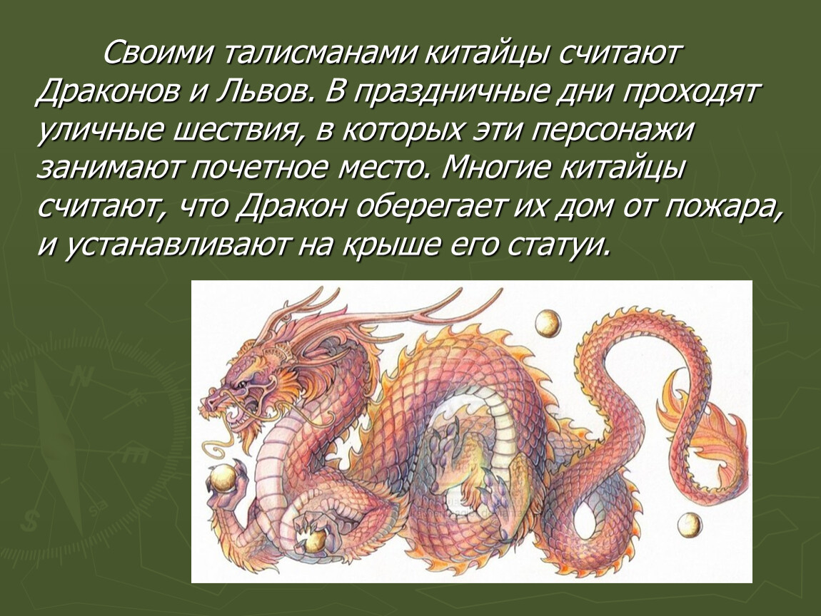 Своими талисманами китайцы считают Драконов и Львов. В праздничные дни проходят уличные шествия, в которых эти персонажи занимают почетное место. Многие китайцы считают, что Дракон оберегает их дом от пожара, и устанавливают на крыше его статуи.