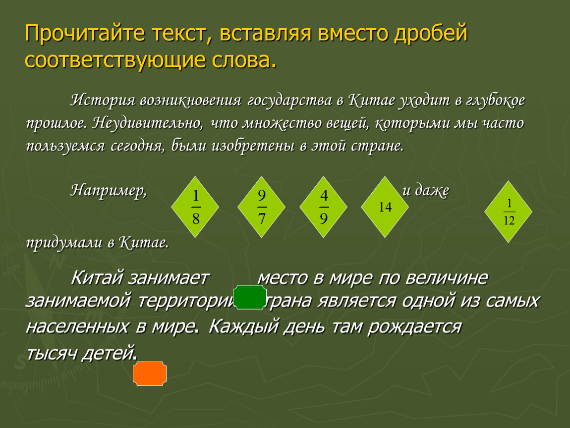 Прочитайте текст, вставляя вместо дробей соответствующие слова.