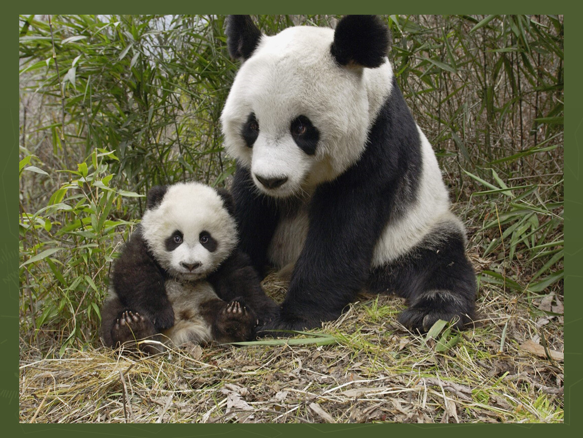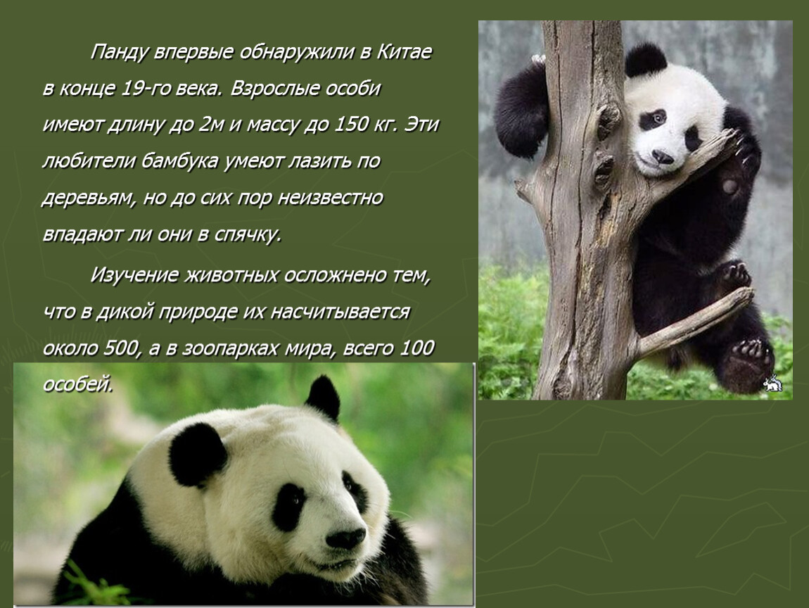 Панду впервые обнаружили в Китае в конце 19-го века. Взрослые особи имеют длину до 2м и массу до 150 кг. Эти любители бамбука умеют лазить по деревьям, но до сих пор неизвестно впадают ли они в спячку.