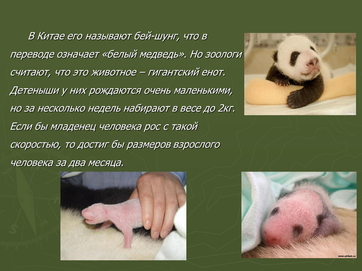 В Китае его называют бей-шунг, что в переводе означает «белый медведь». Но зоологи считают, что это животное – гигантский енот. Детеныши у них рождаются очень маленькими, но за несколько недель набирают в весе до 2кг. Если бы младенец человека рос с такой скоростью, то достиг бы размеров взрослого человека за два месяца.
