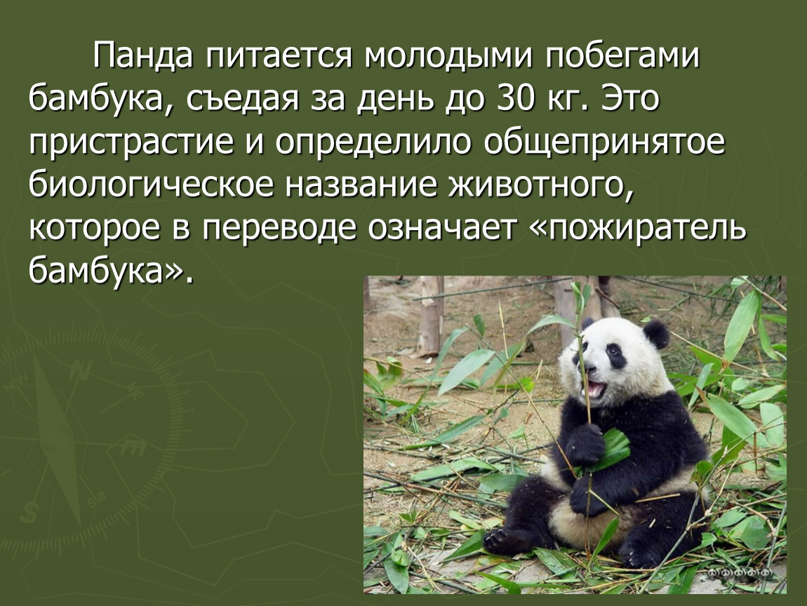 Панда питается молодыми побегами бамбука, съедая за день до 30 кг. Это пристрастие и определило общепринятое биологическое название животного, которое в переводе означает «пожиратель бамбука».