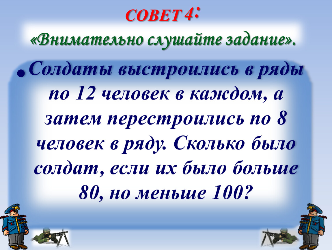 Солдаты выстроились в ряды по 12 человек в каждом, а затем перестроились по 8 человек в ряду. Сколько было солдат, если их было больше 80, но меньше 100?