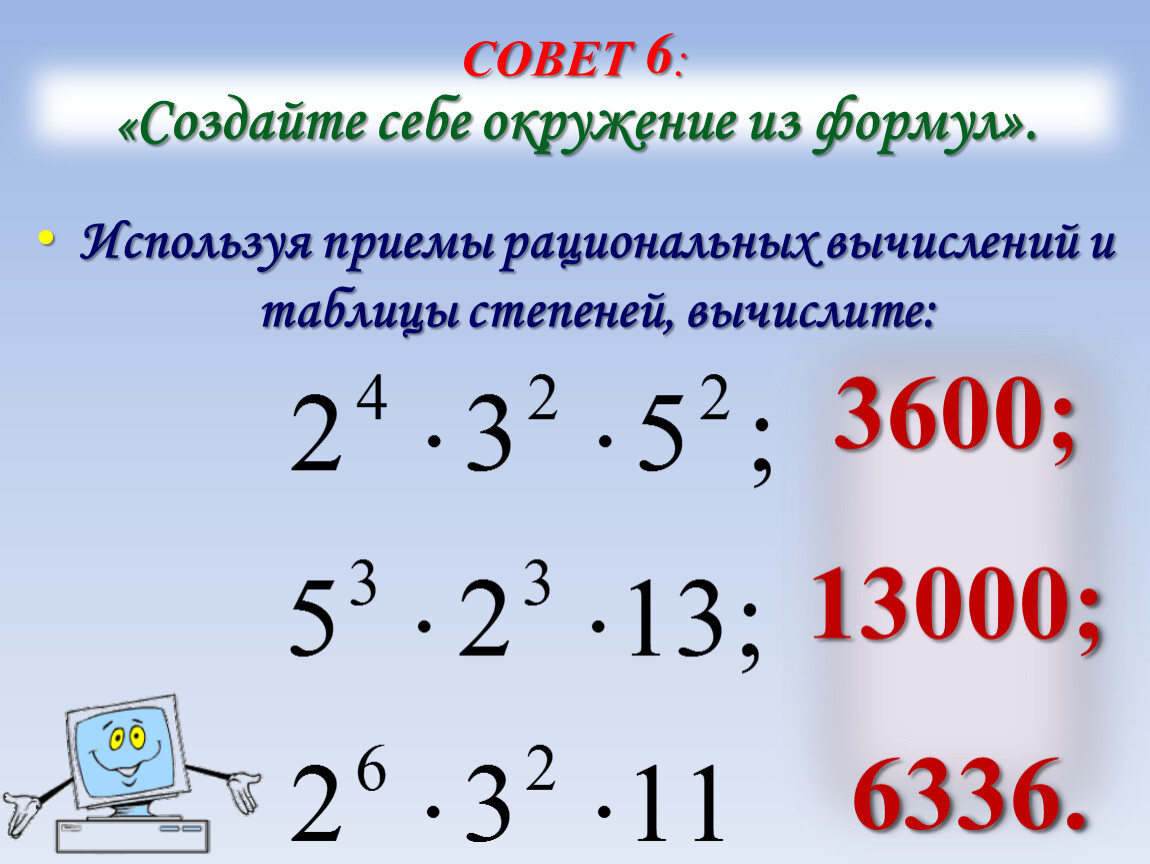 Используя приемы рациональных вычислений и таблицы степеней, вычислите:
