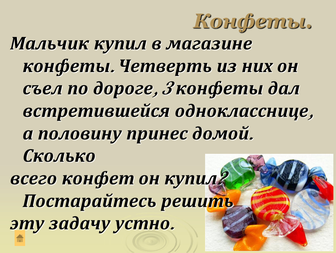 Мальчик купил в магазине конфеты. Четверть из них он съел по дороге, 3 конфеты дал встретившейся однокласснице, а половину принес домой. Сколько