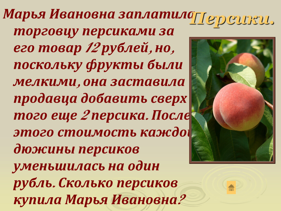 Марья Ивановна заплатила торговцу персиками за его товар 12 рублей, но, поскольку фрукты были мелкими, она заставила продавца добавить сверх того еще 2 персика. После этого стоимость каждой дюжины персиков уменьшилась на один рубль. Сколько персиков купила Марья Ивановна?
