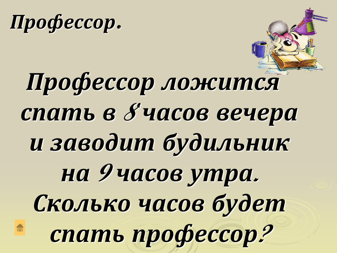 Профессор ложится спать в 8 часов вечера и заводит будильник на 9 часов утра. Сколько часов будет спать профессор?