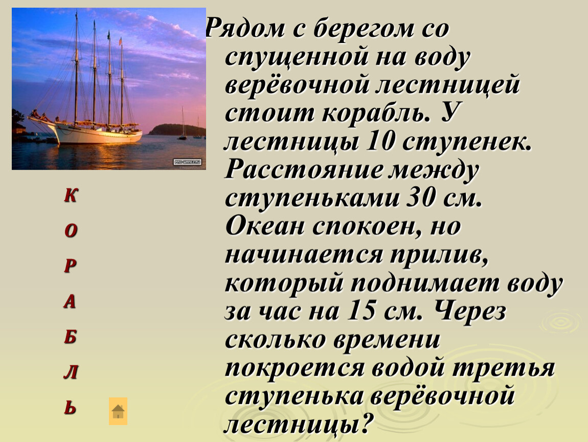 Рядом с берегом со спущенной на воду верёвочной лестницей стоит корабль. У лестницы 10 ступенек. Расстояние между ступеньками 30 см. Океан спокоен, но начинается прилив, который поднимает воду за час на 15 см. Через сколько времени покроется водой третья ступенька верёвочной лестницы?