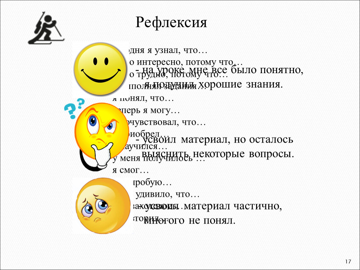 сегодня я узнал, что…было интересно, потому что…было трудно, потому что…я выполнял задания…я понял, что…теперь я могу…я почувствовал, что…я приобрел…я научился…у меня получилось …я смог…я попробую…меня удивило, что…мне захотелось…я повторил…