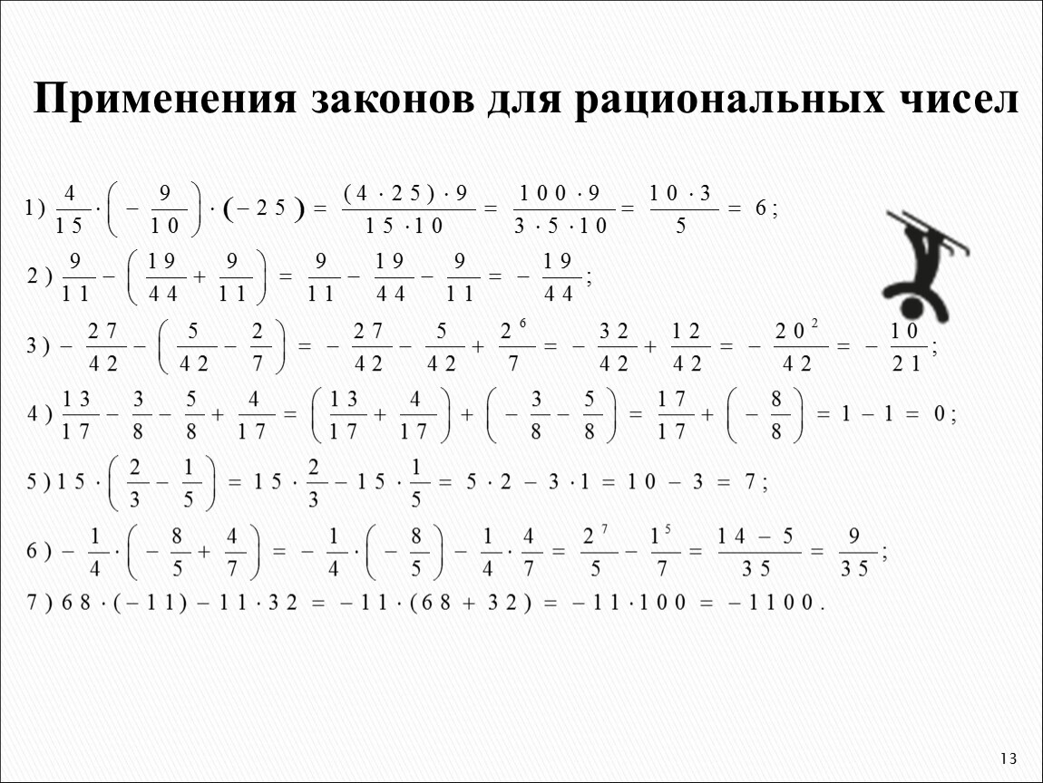 4. Распределительный закон относительно вычитания | 4. (ab)c=a(bc)=аbc | 4. От перестановки множителей произведение не изменится |