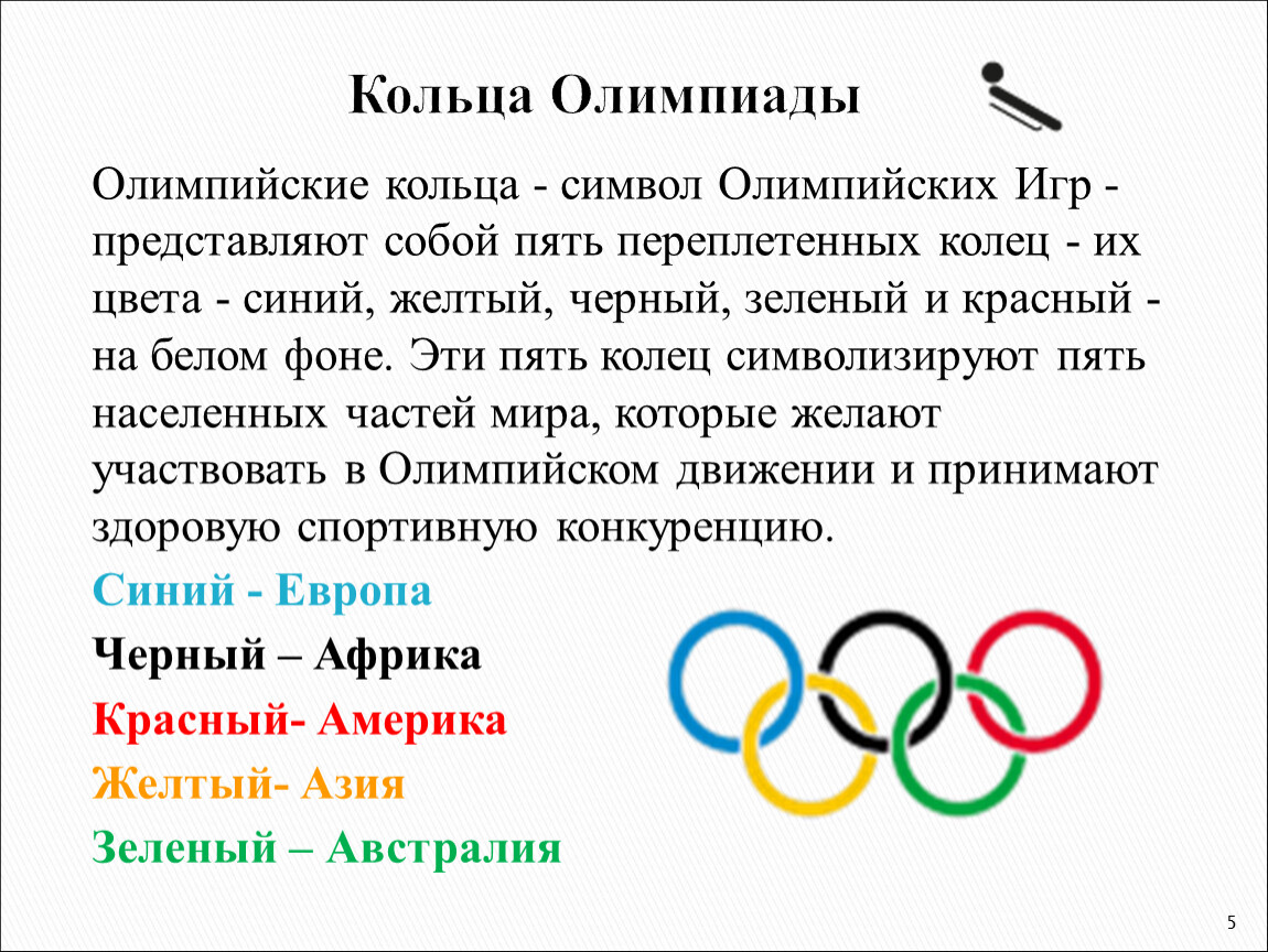 Олимпийские кольца - символ Олимпийских Игр - представляют собой пять переплетенных колец - их цвета - синий, желтый, черный, зеленый и красный - на белом фоне. Эти пять колец символизируют пять населенных частей мира, которые желают участвовать в Олимпийском движении и принимают здоровую спортивную конкуренцию.