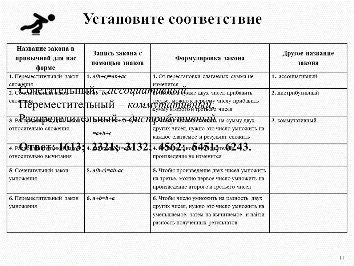 1. Переместительный закон сложения | 1. a(b+c)=ab+ac | 1. От перестановки слагаемых сумма не изменится | 1. ассоциативный |