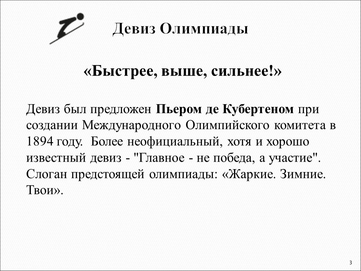 Талисманы нашей Олимпиады – белый мишка, снежный леопард и зайка. Официально понятие «олимпийский талисман» было утверждено летом 1972 года на сессии МОК, проходившей в рамках XX Олимпийских игр в Мюнхене. Решением Комитета талисман стал обязательным атрибутом Олимпийских игр. Миссия олимпийского талисмана — «отразить дух страны-хозяйки игр, принести удачу спортсменам и накалить праздничную атмосферу».