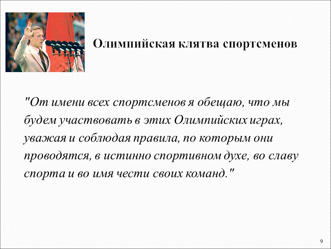 "От имени всех спортсменов я обещаю, что мы будем участвовать в этих Олимпийских играх, уважая и соблюдая правила, по которым они проводятся, в истинно спортивном духе, во славу спорта и во имя чести своих команд."