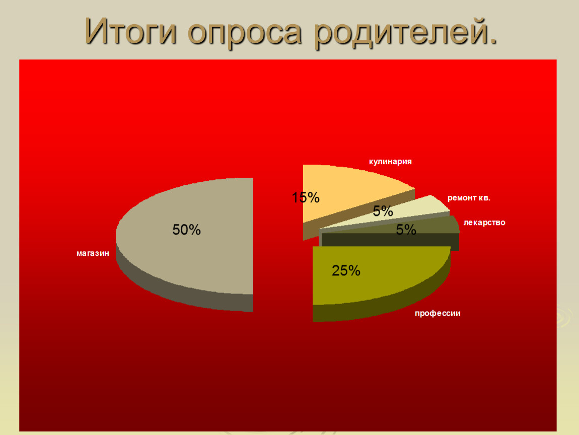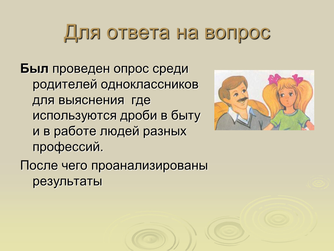 Был проведен опрос среди родителей одноклассников для выяснения где используются дроби в быту и в работе людей разных профессий.