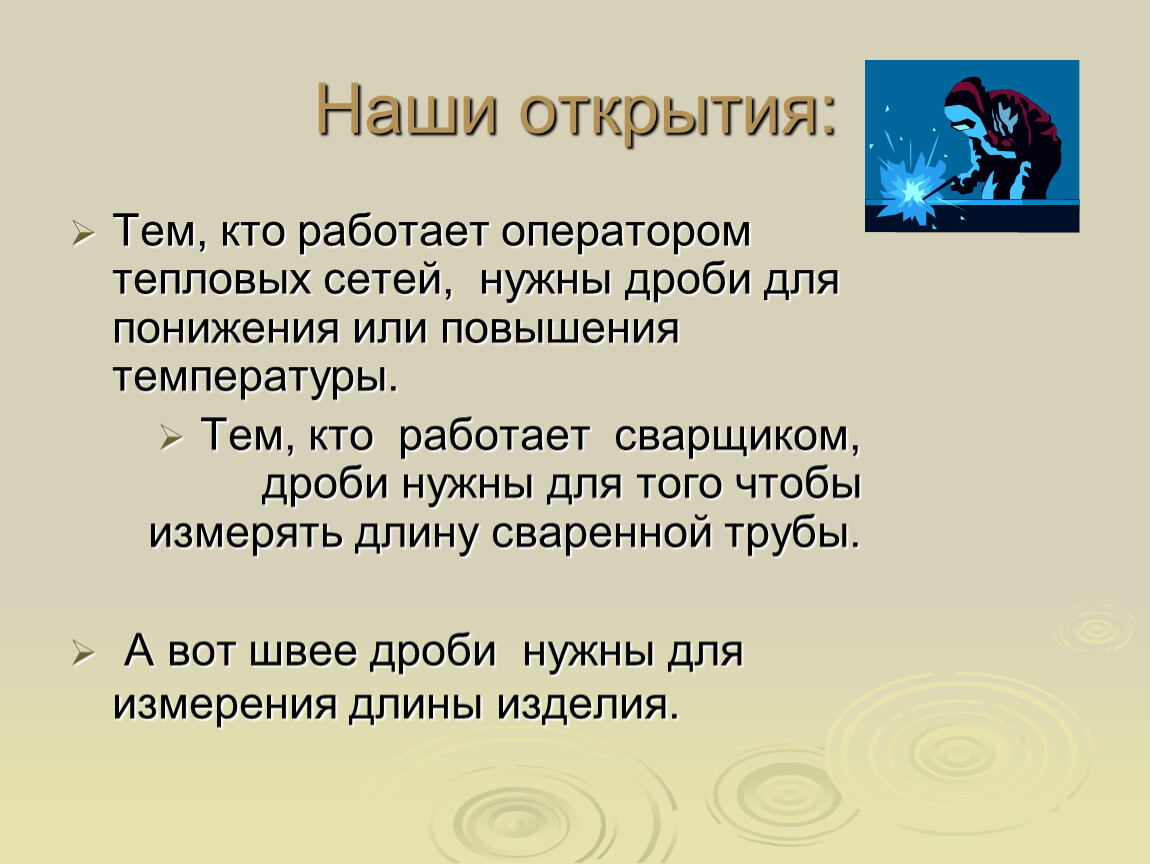 Тем, кто работает сварщиком, дроби нужны для того чтобы измерять длину сваренной трубы.