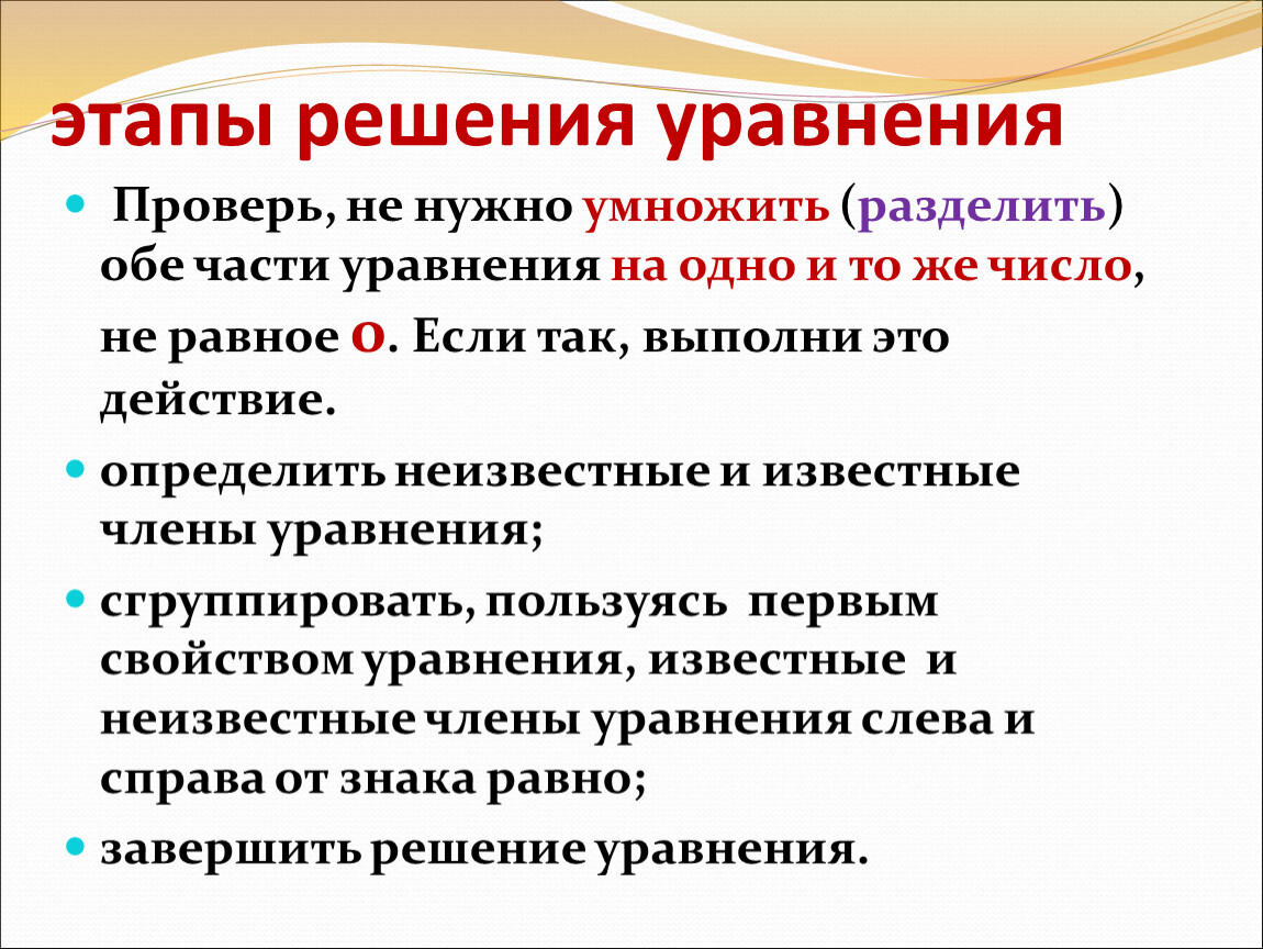 «Корни уравнения не изменяются, если его обе части уравнения умножить или разделить на одно и то же число, не равное 0.»