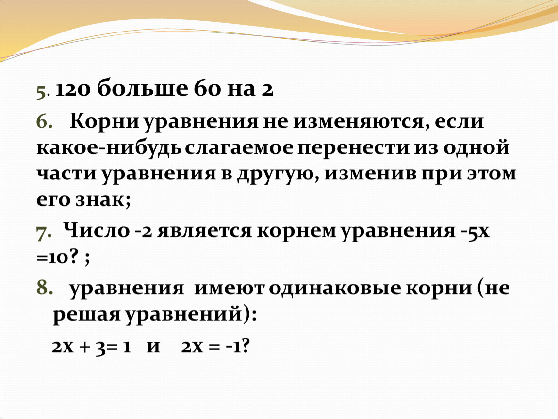 Уравнение-это равенство, содержащие переменную, значение которой надо найти; 1