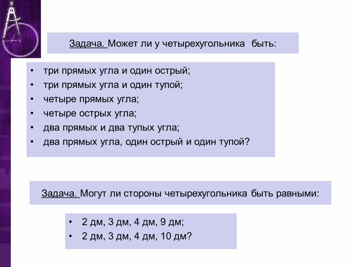 Задача. Может ли у четырехугольника быть: