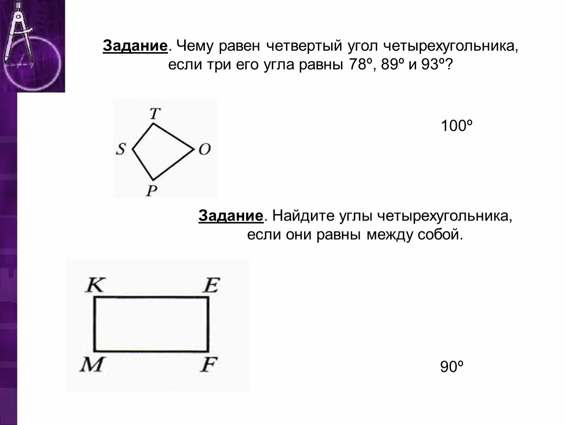 Задание. Найдите углы четырехугольника, если они равны между собой.