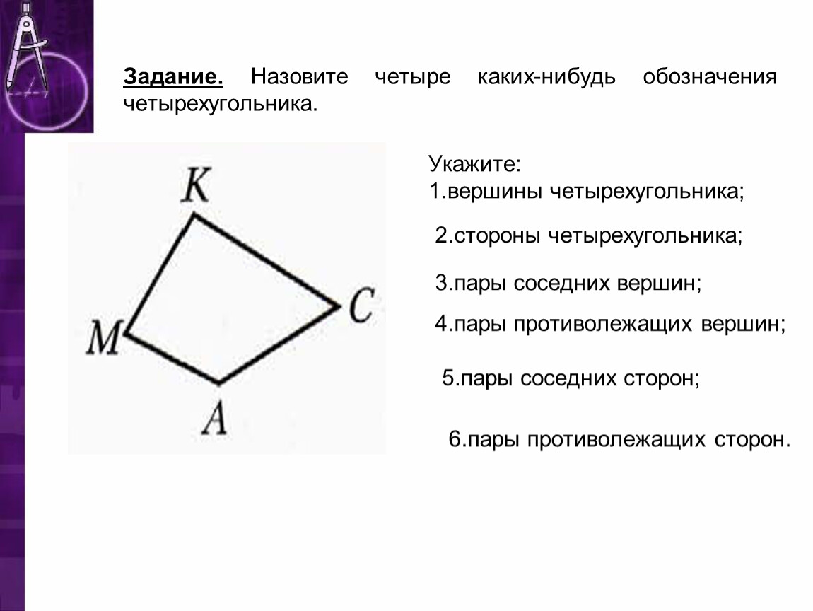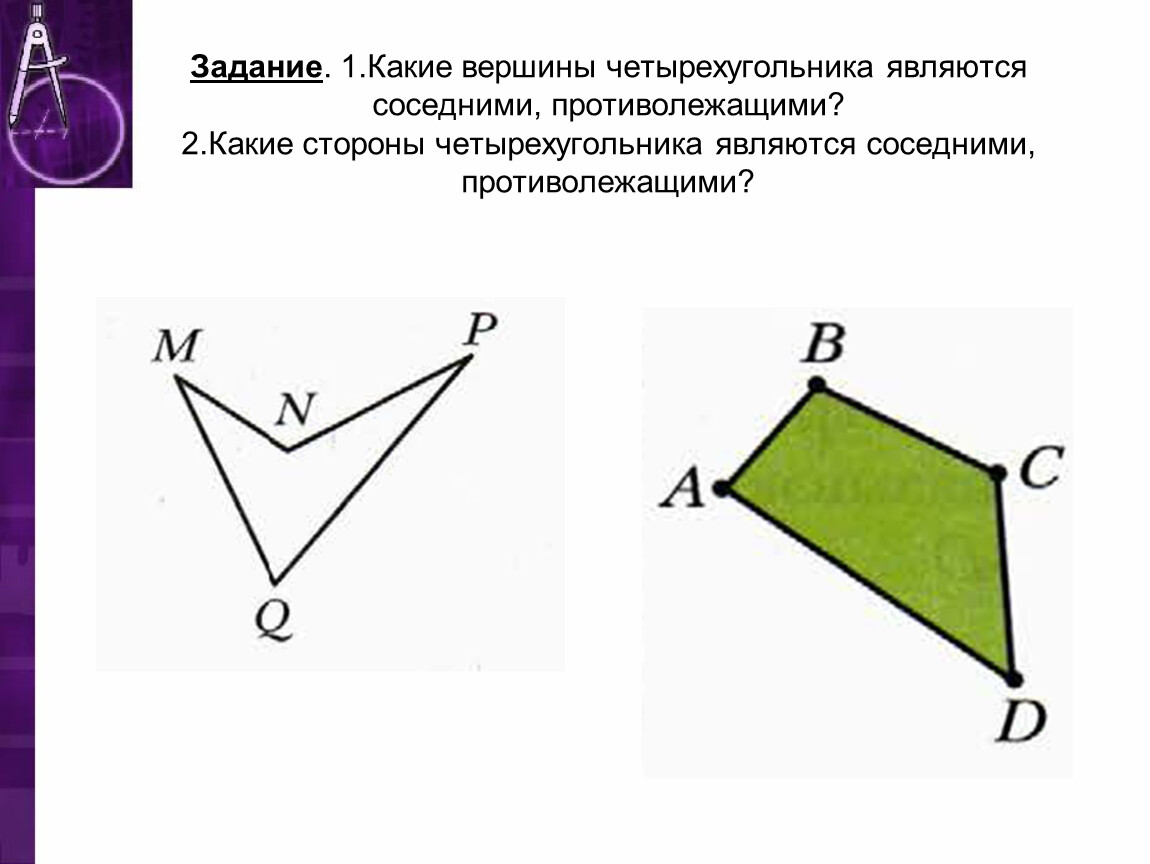 Задание. 1.Какие вершины четырехугольника являются соседними, противолежащими?2.Какие стороны четырехугольника являются соседними, противолежащими?