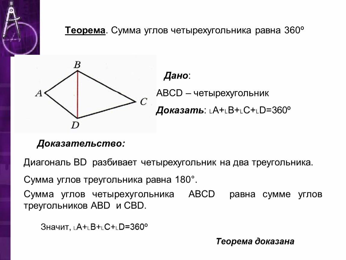 Теорема. Сумма углов четырехугольника равна 360º
