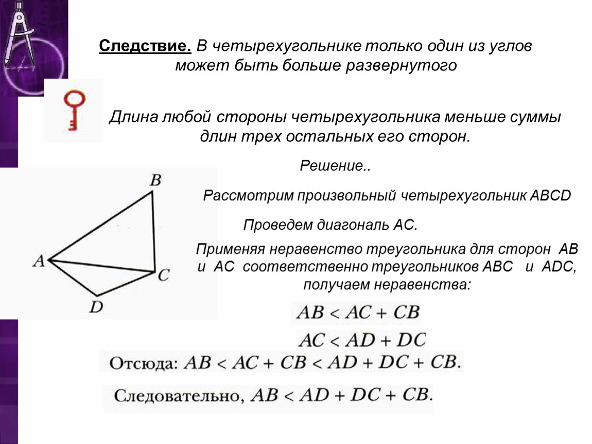 Следствие. В четырехугольнике только один из углов может быть больше развернутого