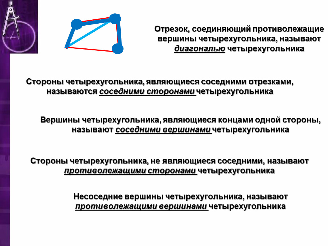 Вершины четырехугольника, являющиеся концами одной стороны, называют соседними вершинами четырехугольника
