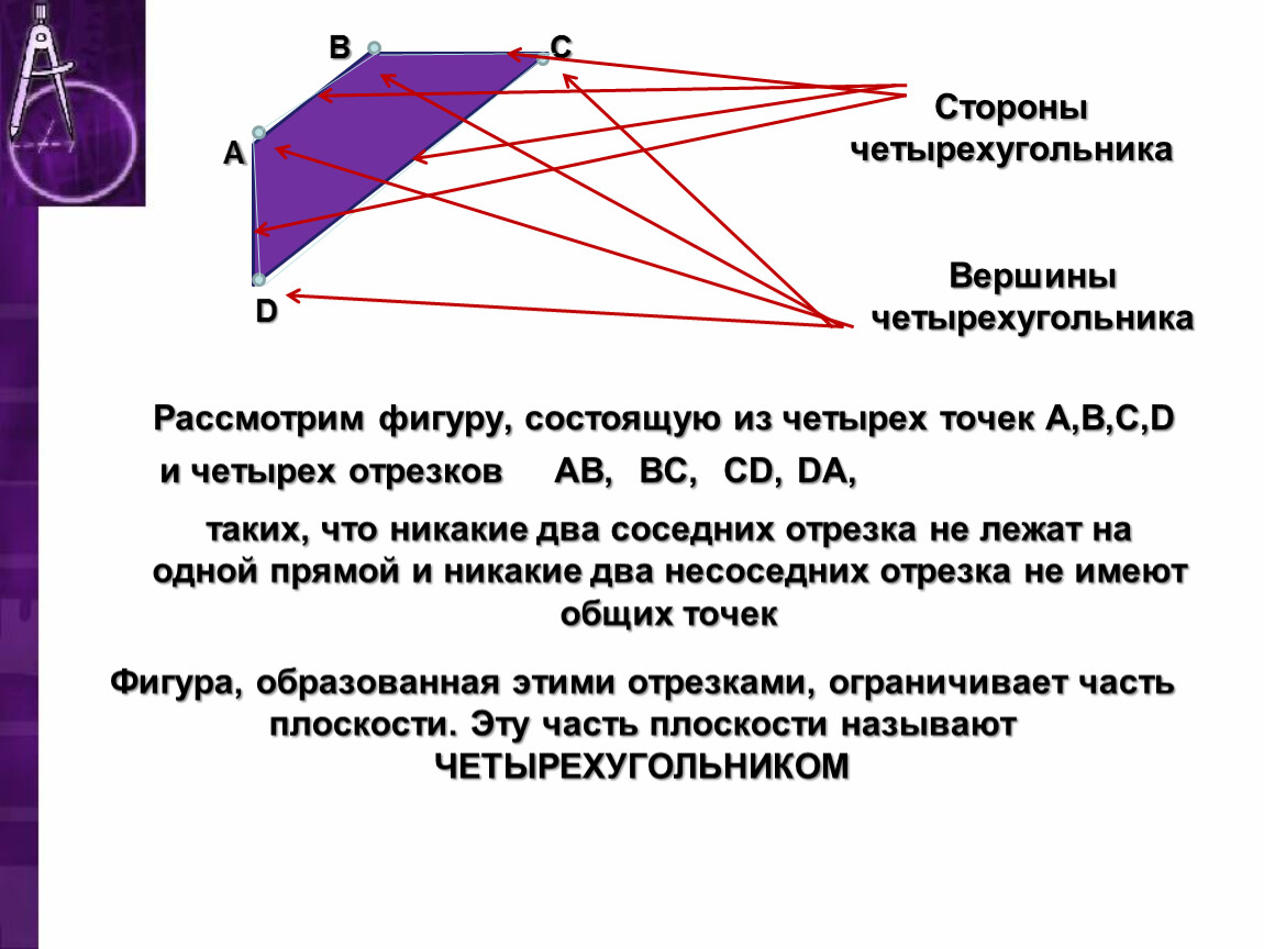 Фигура, образованная этими отрезками, ограничивает часть плоскости. Эту часть плоскости называют ЧЕТЫРЕХУГОЛЬНИКОМ