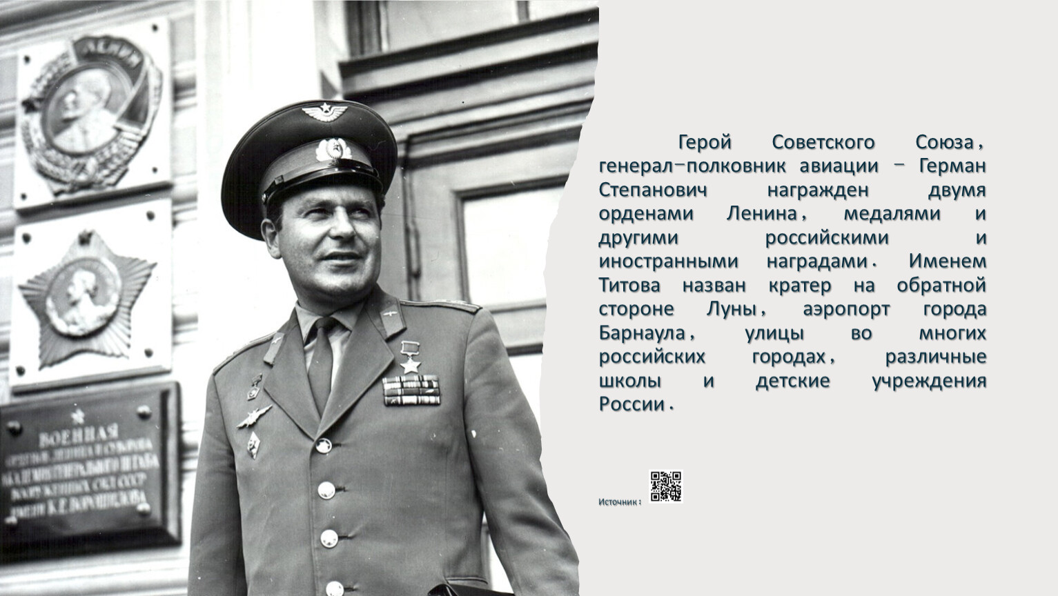 Герой Советского Союза, генерал-полковник авиации - Герман Степанович награжден двумя орденами Ленина, медалями и другими российскими и иностранными наградами. Именем Титова назван кратер на обратной стороне Луны, аэропорт города Барнаула, улицы во многих российских городах, различные школы и детские учреждения России.